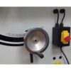 A 3hp braked induction motor supplies the power, turning the 12″ diameter blade via a drive belt. It allows for a cutting depth of up to 100mm (4″) depth. Blade height is adjusted using the front hand wheel, from 0 to 100mm. The crown guard has a dust extraction outlet and a hose to carry the dust to the combined collection point at the back of the saw. The 100mm diameter outlet also collects from underneath the saw blade.