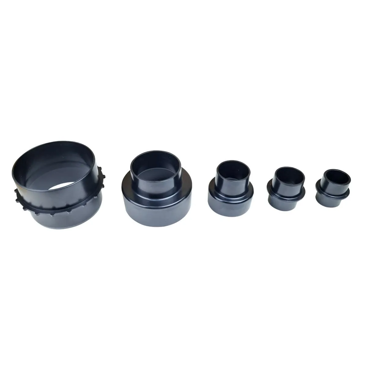 This Reducer set consists of a hose end collar, for 100mm diameter hose, and 4 pieces which can be used individually or joined together as a single reducer.