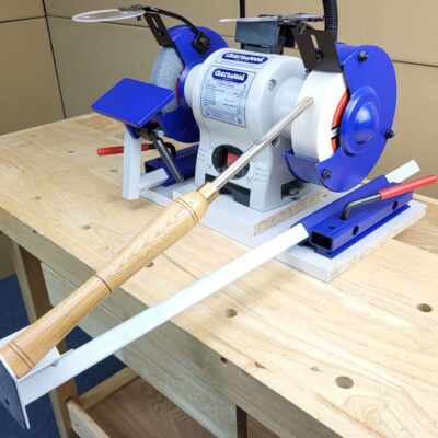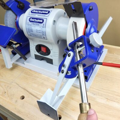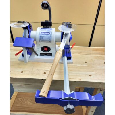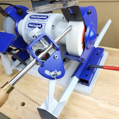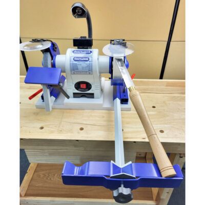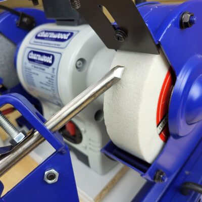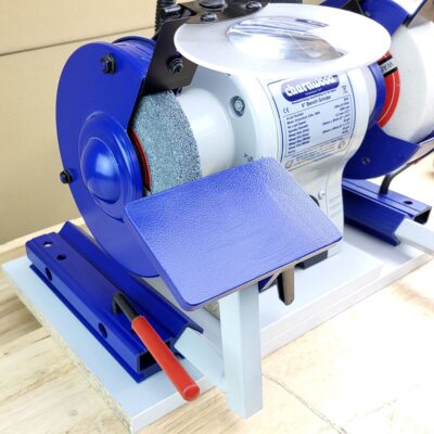Compatible with most 6″ and 8″ double end bench grinders. Ideally both the bench grinder and the base clamp should be fixed to the bench to ensure repeatable results. For a more portable solution attach everything to a base board which can be moved off the bench when required.