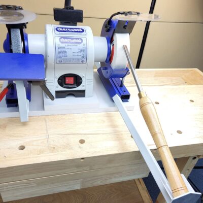 The universal sharpening system for wood turners can be used in conjunction with a bench grinder to create accurate cutting angles and straight edges.
