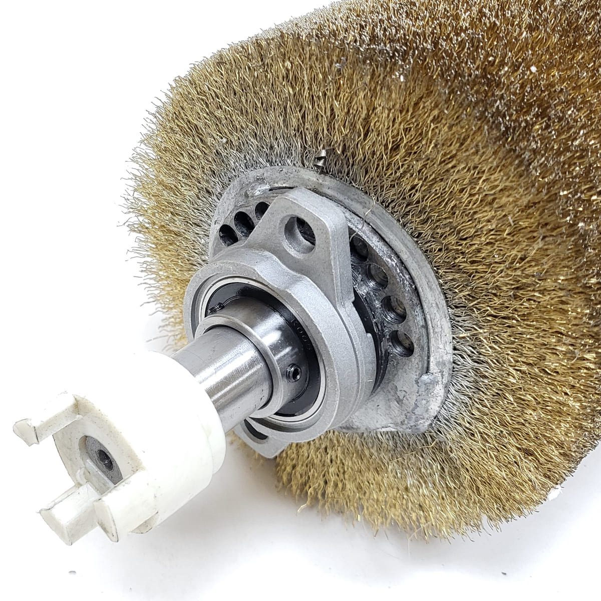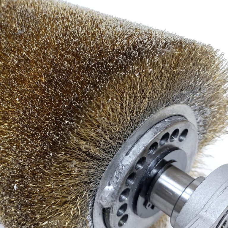 This optional steel wire brush head uses long bristles of flexible wire to produce a textured finish.
