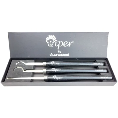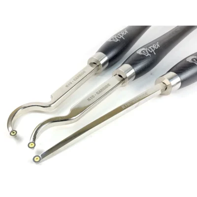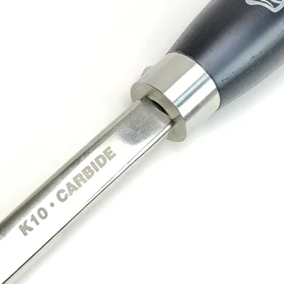 The handles are 390mm long and made from European Black Ash. A distinctive stainless steel ferrule connects a steel shaft which is chrome finished and laser etched. On the end is mounted a Tungsten Carbide (TC) cutting tip. The 3 razor sharp round cutting tips are 9mm in diameter with a bevelled edge. Carbide cutters are presented to the timber at 90 degrees and cut with a scraping action. The shaft of these tools are designed to allow access for hollowing out the inside of all kinds of bowls, whatever the shape and depth.