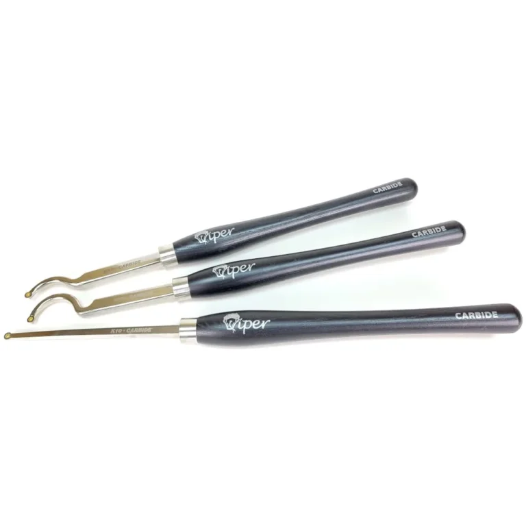 A set of 3 carbide scraper turning tools, incorporating the newest technology in woodturning: Replaceable carbide cutting tips.