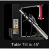 Precisely tilt the worktable from 45 degrees to -15 degrees using a robust worm-gear system with a heavy-duty hand wheel. A gas filled spring overcomes the weight of the large table allowing even micro-adjustments to be made smoothly. A hinged 90 degree stop allows the table to tilt backwards to -15 degrees.