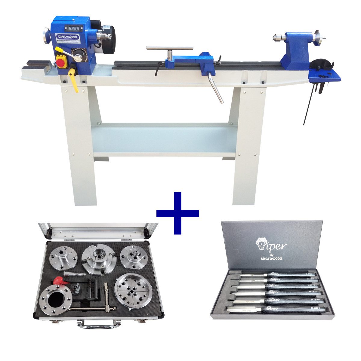 Supplied with floor stand, 25mm diameter 4 prong drive centre with spring loaded centre point, 43mm diameter revolving tail centre, 150mm diameter faceplate, knock out bar, onboard tool storage tray, 2.5m power cable and UK 3 pin plug.