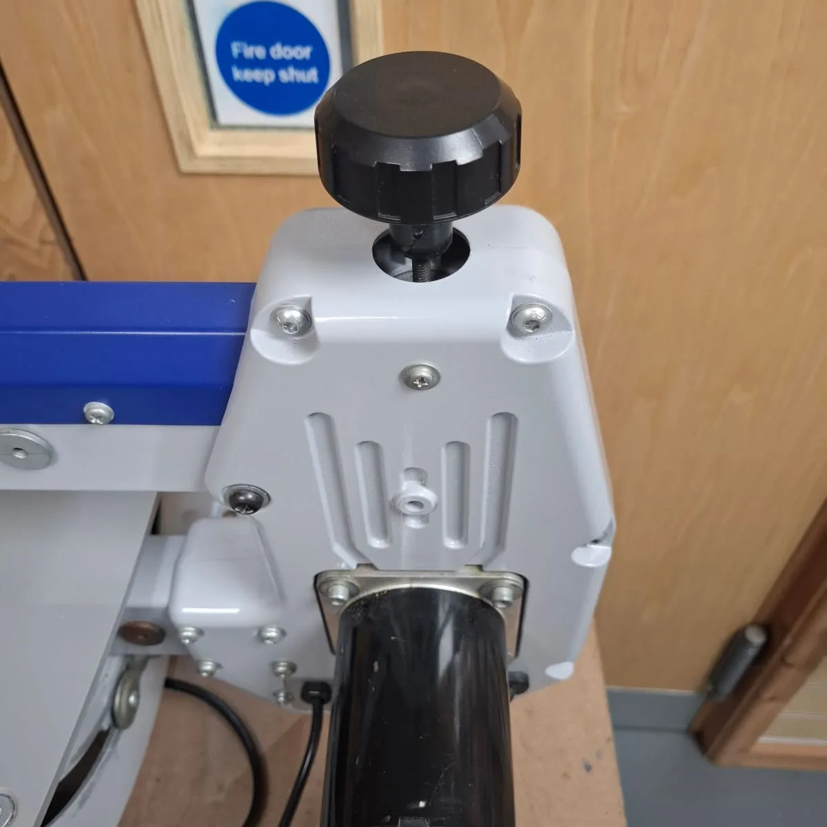 This enables the user precise control over the work, which is placed on the large horizontal fixed steel table. Both hands are free to guide the work piece, while simultaneously controlling the blade speed via their foot operated throttle pedal switch. This is the safest practice for accurate cutting.