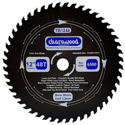 TB1248 Combination: Medium Finish, suitable for ripping and crosscutting in softwood, hardwood, exotic timber, plywood, particle board and MDF