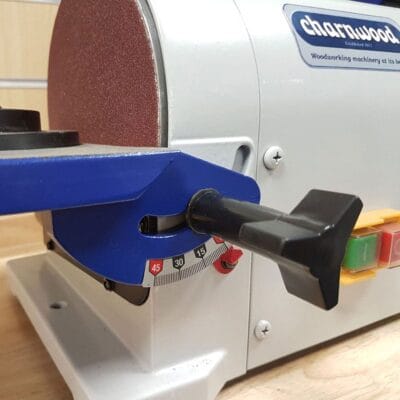 The disc sander side has a 150mm diameter disc complimented by a solid one piece aluminium work table with 45 degree tilt. A mitre guide fits onto a slot in the work table allowing the disc to be used for accurate sanding of square edges as well as bevels, mitres and even compound angles. A dust extraction outlet is provided to connect to a suitable vacuum or extractor.